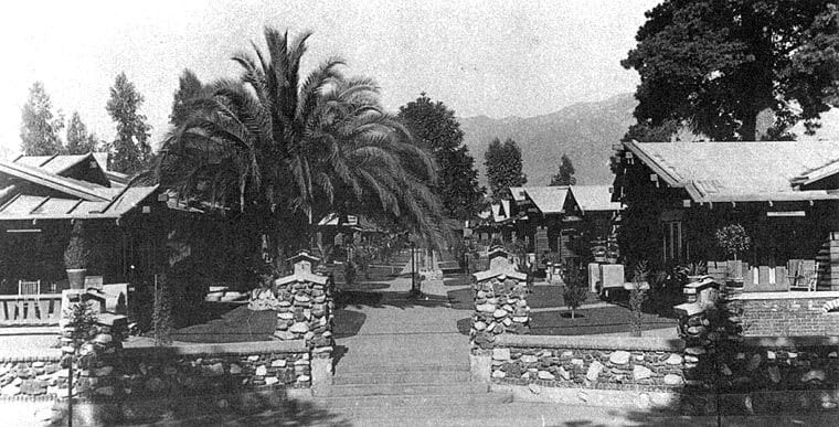Historically, multi-household courtyards were used in 12th c. Chinese tulou settlements, Dutch hofje almshouses in the 15th c., and in summer church revival encampments in the mid-1800s. Bungalow Courts came on the scene around 1910 in Pasadena, CA, to provide affordable housing and immediate sense of community to throngs of immigrants arriving from the east. This pattern morphed into apartment courts and motor courts (motels) throughout America. In 1920s, Clarence Stein and Henry Wright introduced a courtyard/cul-de-sac pattern of suburban development in Radburn, NJ.