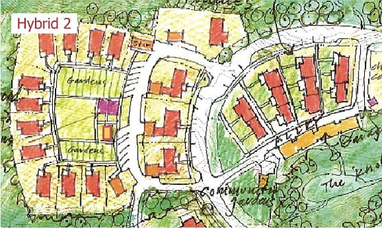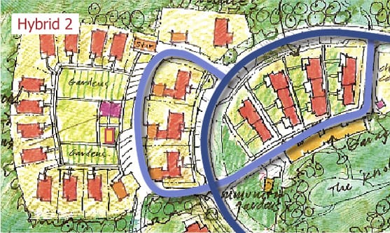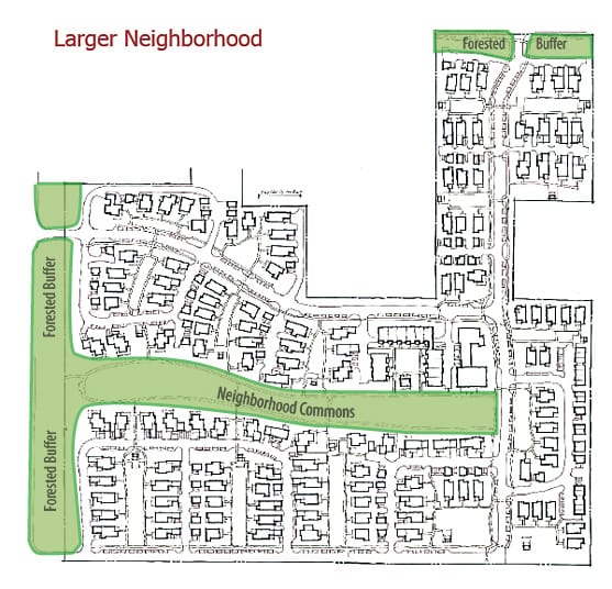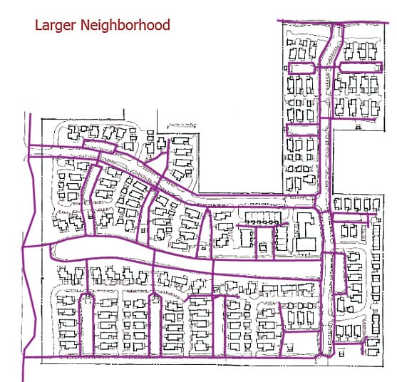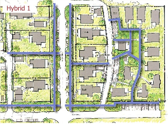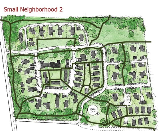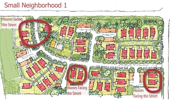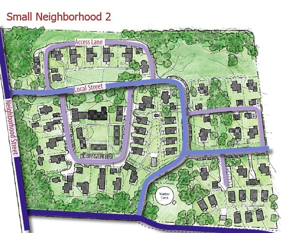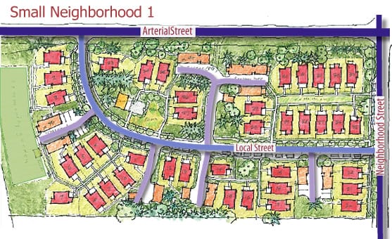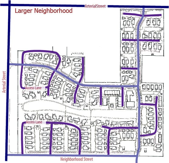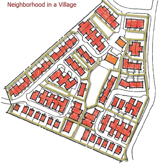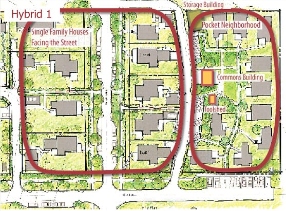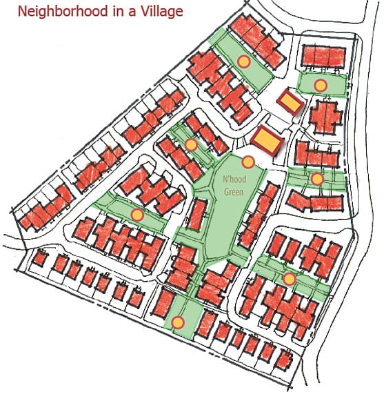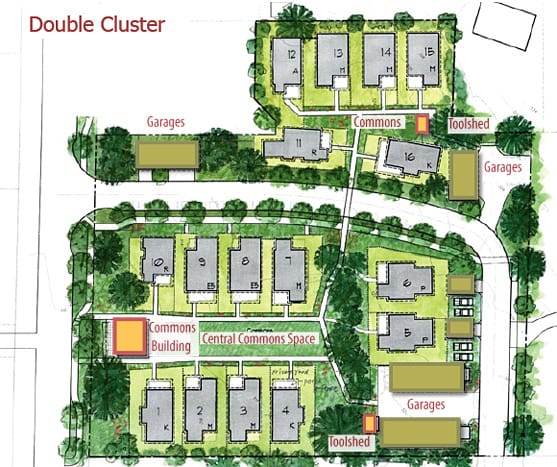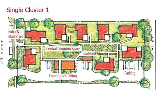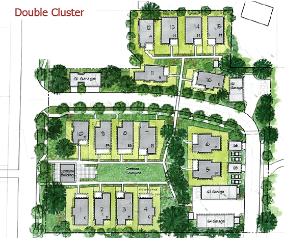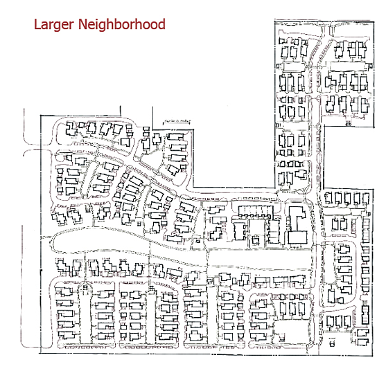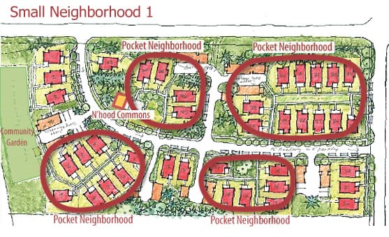 Pocket Neighborhoods are clustered groups of about 6 to 12 houses or apartments around a shared open space. Larger communities can have multiple pocket neighborhoods connected by walkways, and often include more significant commons buildings and gardens used by the whole group. The Pocket Neighborhood book illustrates and tells the story of many such communities. The online examples here show a range of site plans from a single cluster to entire neighborhoods, along with descriptions of the key Design Patterns underlying their form.
