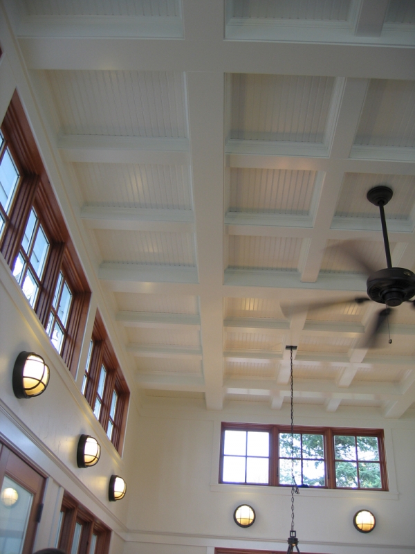 In a nod to early island buildings, the house features deep-green siding and white trim. And it picks up on the original inn’s hipped roof and broad porch. However, the new building is far from a copy: the new design takes off on its own course to shelter a modern family in style. The interior of the home is centered on the front room — with a 14-foot-high coffered ceiling and divided-lite windows on three sides opening to the views. A full-sized kitchen pulls its weight for extended family gatherings, yet with a lower ceiling and an eating alcove to the side, is intimate enough for two. Farther back in the house is the den/media room and bedrooms, and a loft for grandkids.