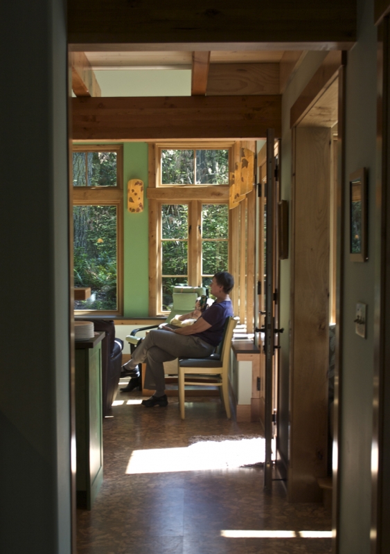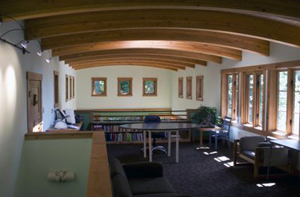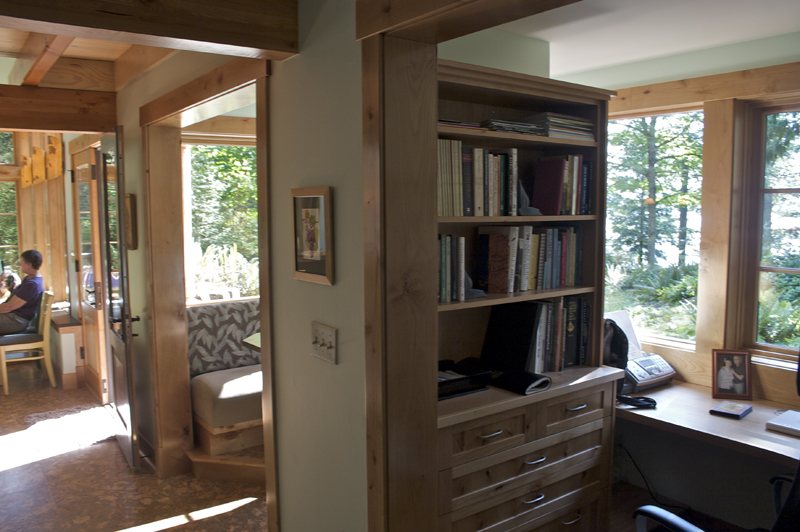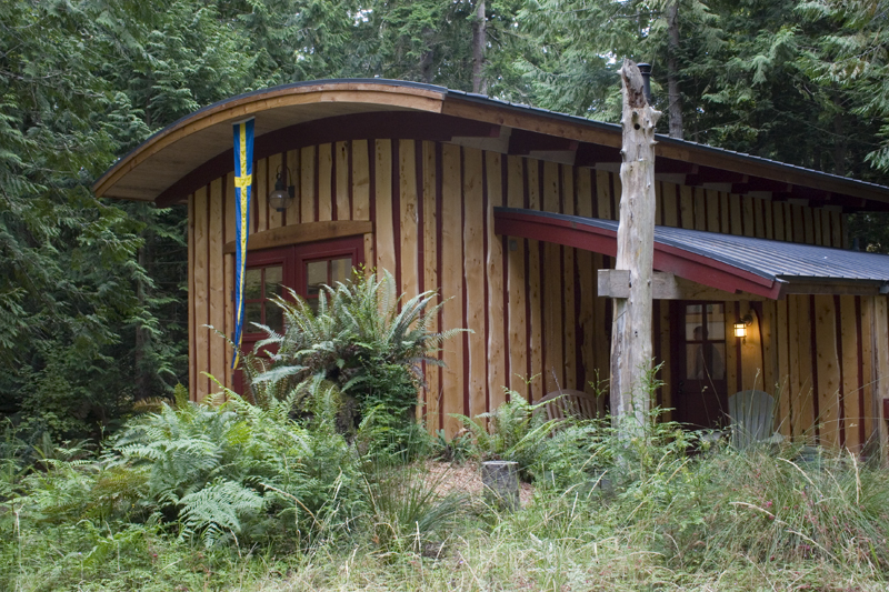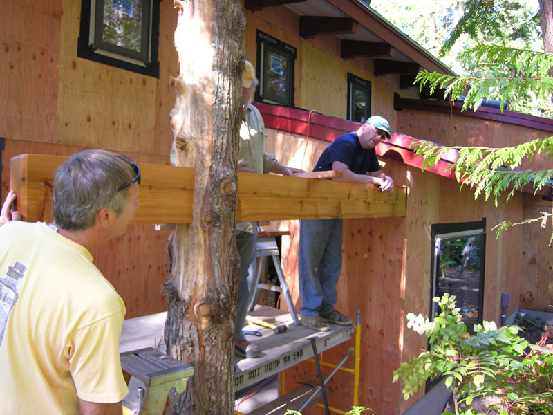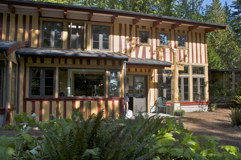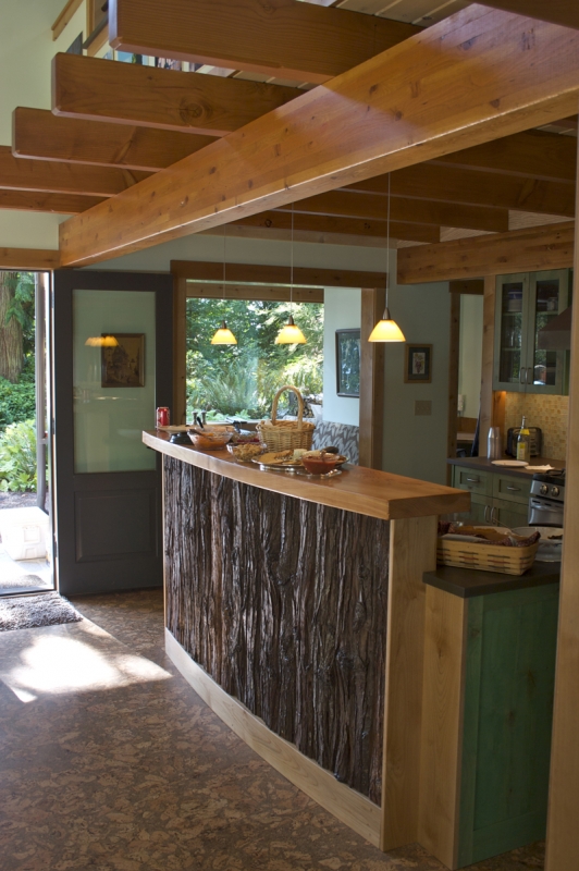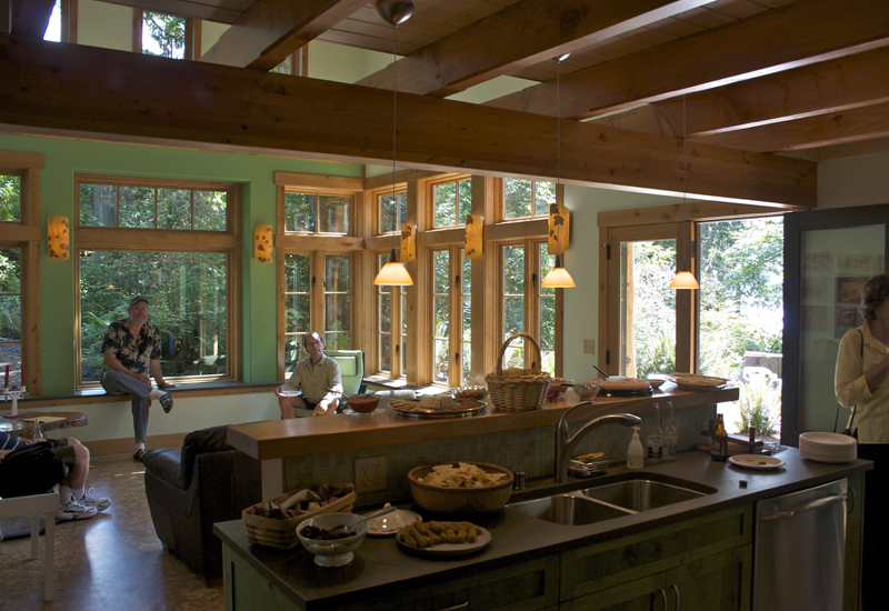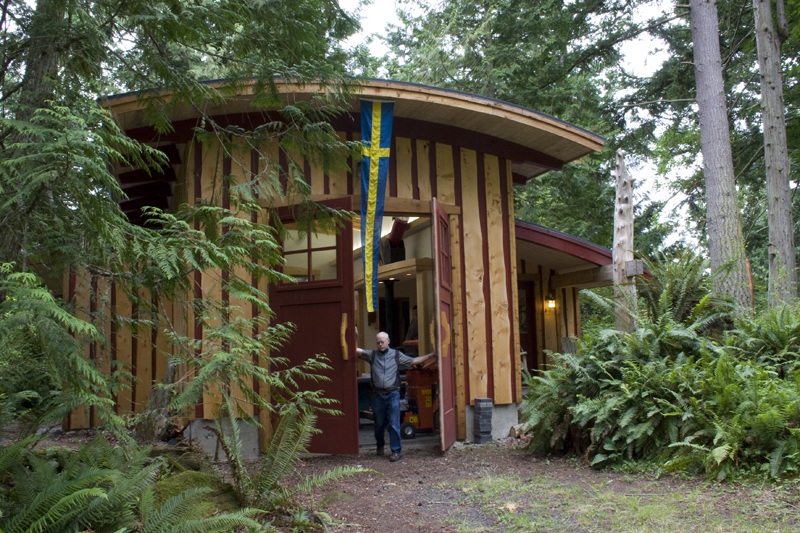 This unique shop and house began as a whimsical sketch of a roof shedding the Northwest rain. The shop—fondly named Skaboose—was the first structure built, and included an elegant yet minimal living quarters for owners coming to the site for long weekend retreats. 10-foot high doors open to the outside “for those extra big projects,” and “for fun.”  The main house continues the gesture of curved beams with a contemporary echo of a traditional longhouse.  The few trees taken down on the site were milled and hewn into beams, columns and accent paneling (with significant efforts by the owners and their children).  The builders were Fred Kimball and Rick Landis (Kimball/Landis Construction), with craftsmen Maurice Hughes and Malcom Larner.