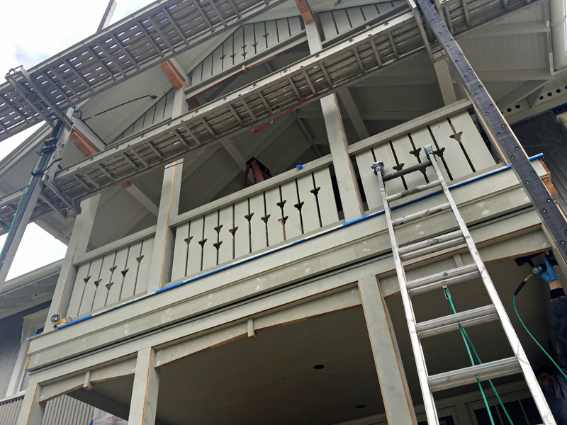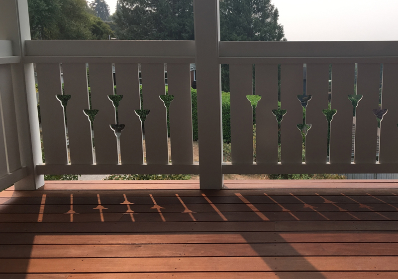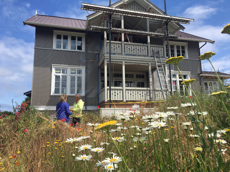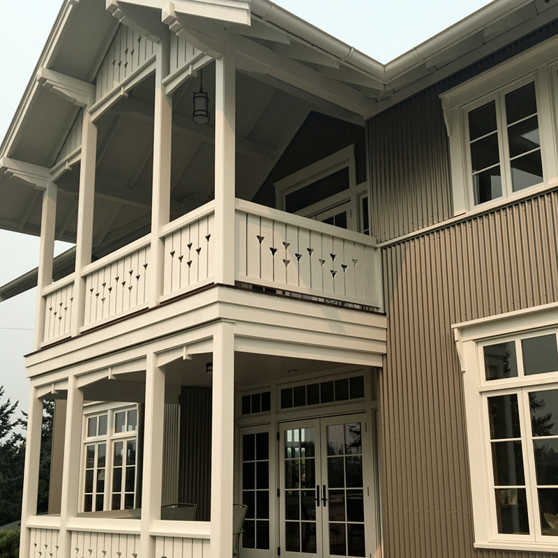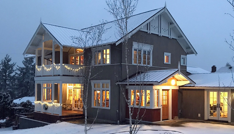 Svietserstil style in Norway originated in the late 18th / early 19th century, taking elements from Swiss country houses. It is characterized by gabled roofs with wide eaves, a two-story porch running perpendicular to the main roof, richly decorative trim, and vertically proportioned French-opening windows. Continuing in a tradition of borrowed styles, this version uses corrugated metal siding, a simplified trillium flower motif for railings and gable end ornamentation. While the main building is mainly symmetrical, the mudroom entry into the kitchen and the side studio introduce an asymmetrical accent.