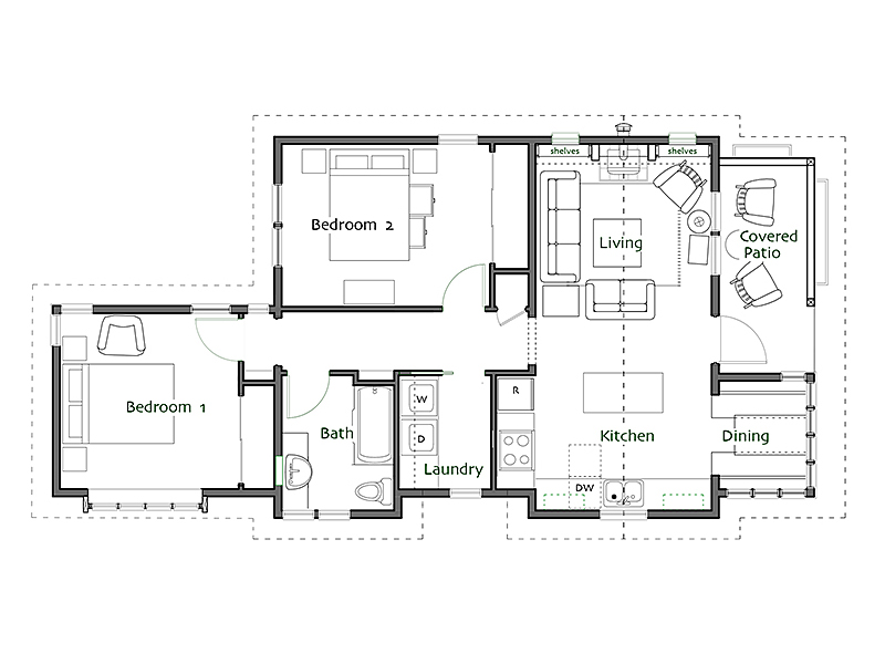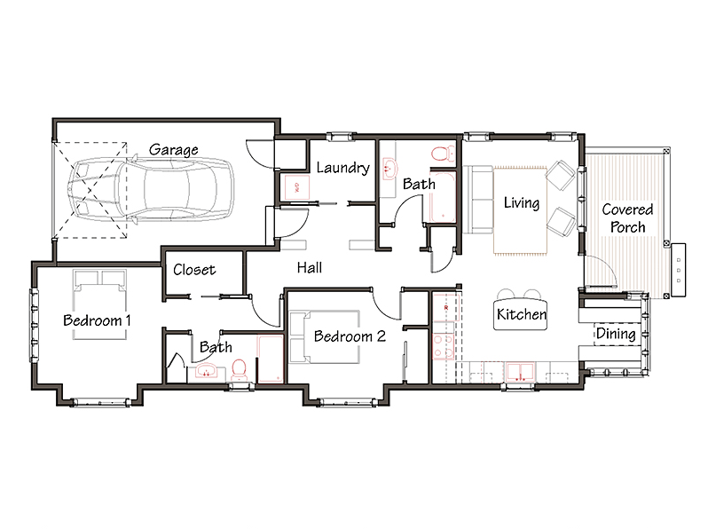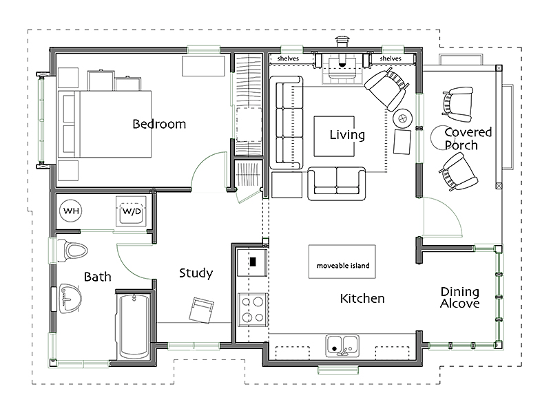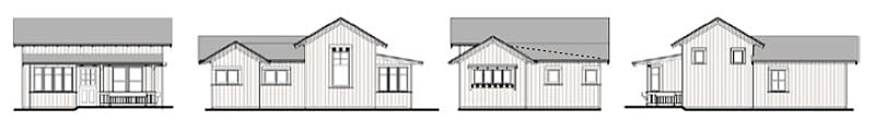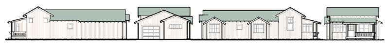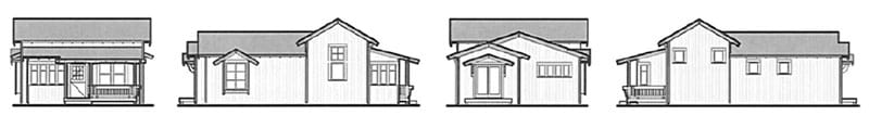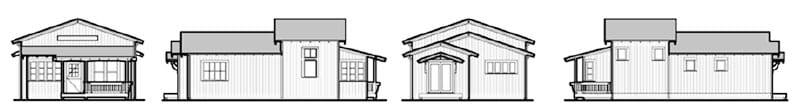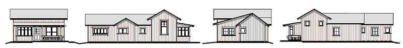 The Betty Cottages: a family of charming one-story homes. Step inside from a room-sized front porch into the main room – a vaulted ceiling rises from 10-foot-high side walls and light comes in from windows on three sides, making this space feel surprisingly large. A cozy eating alcove off the kitchen is a lovely spot for a meal or homework.