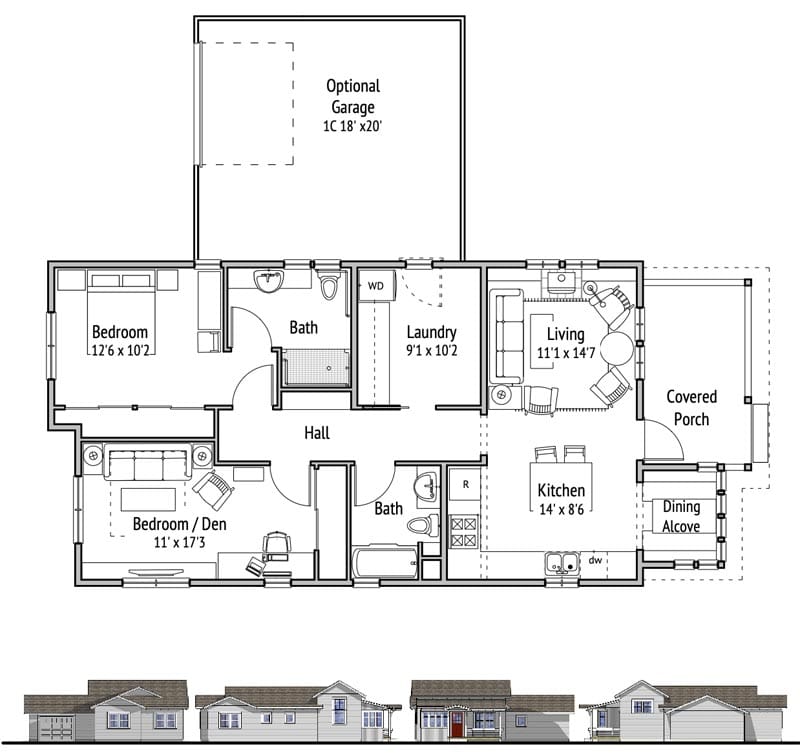 This Betty sister has an ensuite bedroom/bath, a second bedroom/den, and a laundry/storage room. An optional attached garage is available. This plan is full accessible with 36″ doors and roll-in shower.