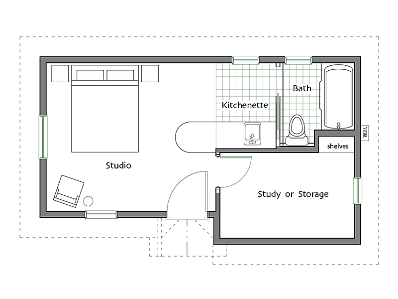 Blue Sky Cabin This simple plan with a vaulted ceiling makes for a great little guest house, home office or creative retreat space. A kitchenette, bathroom and side room can serve multiple uses. The gabled overhang provides an artistic accent to the entry. Blue Sky Cabin 310 0B 1B 1 Story310 SFStudio1 Bathroom Footprint: 24′ x 14′ Height to roof peak 13′ -5″ $650.00ADD TO CART Floor Plan and Elevations PDF Frequently Asked Questions License Agreement
