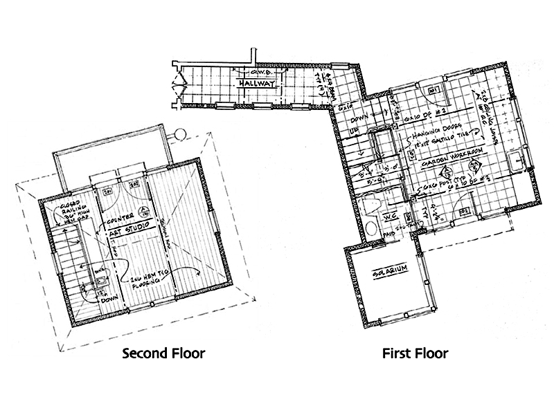 As an extension of the Dine’s Point House—or as a stand-alone retreat—this is a space for inspired living. The main room on the ground floor features a tiled floor and a high ceiling with exposed wood beams and joists. Add a work counter with a sink, and you’re ready to make a creative mess. Off this central space is a small bath, and beyond that, a solarium tub-room with tall windows opening onto a private garden.