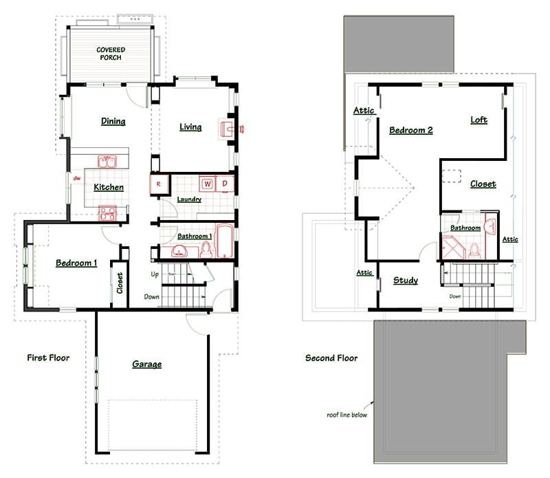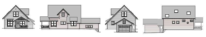 A steeply gabled roof make this an iconic image of home. The rooms of the main living space open to one another in an ‘L’ configuration, yet have definition. The kitchen has a commanding outlook from behind a serving counter. The dining room has windows on two sides, and a view into the living room through a cased opening of shelving and cabinets. With a raised 9-foot ceiling and a tall bay window, the living room has a spacious feel. The main roof extends down over the bedroom on the main floor. A large bedroom suite is on the second floor. One-half flight of stairs down from the main floor is the garage.