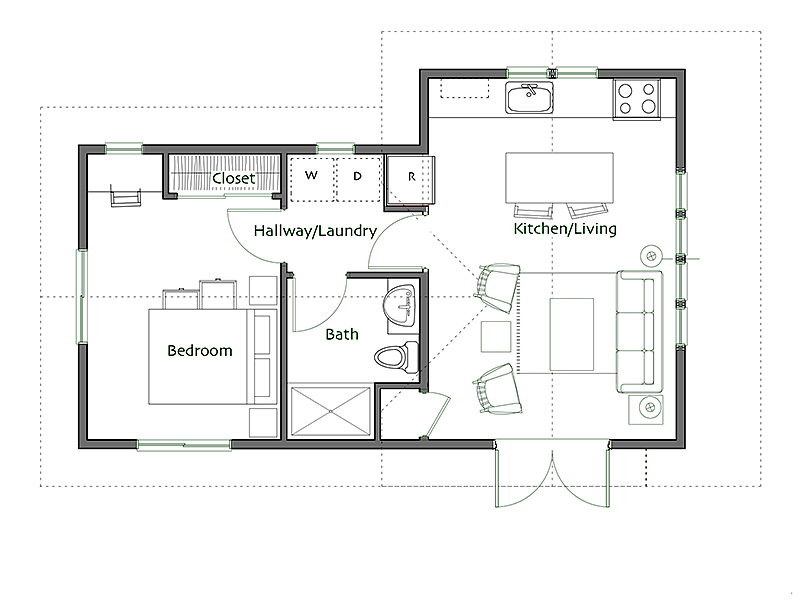 This multi-possibility accessory building can be a backyard writing or art studio, an office, a dwelling for an elderly parent or adult child, a guest house, or a rental unit. Or, it might be a commons building for a pocket neighborhood.