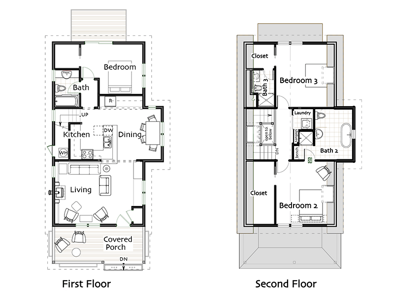 In this version, the main house measures 20-feet wide by 40-feet long and has trellises on the open side elevation.