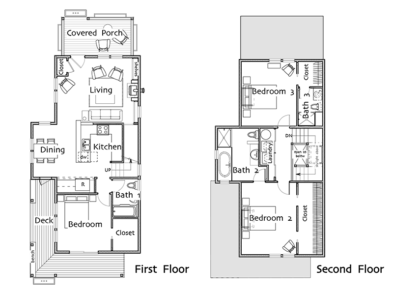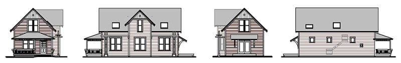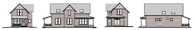 This house measures 18-feet by 41-feet 6-inches and has a covered side porch opening into the dining room. This version was designed by our lead designer at the time, Karen DeLucas, and built by her builder-husband. She named it “Karina”. Her blog tells the story of construction and shares lots of details: http://detailsofhome.blogspot.com/search/label/Karina
